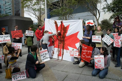 In Durban, South Africa, visiting Secretary of State Hillary Clinton had to cross a picket line thrown up by climate justice campaigners. “We were wearing Barack Obama T-shirts,” said organizer Patrick Bond. He said the pickets would continue weekly. In Wellington, New Zealand, 35 campaigners carrying signs that said “We Are All Downstream” and “Don’t Tar Canada’s Reputation” gathered with an oil-stained flag outside the Canadian embassy. “The Embassy shut down for the afternoon rather than deal with us,” said Aaron Packard, Pacific director for the climate campaign 350.org.